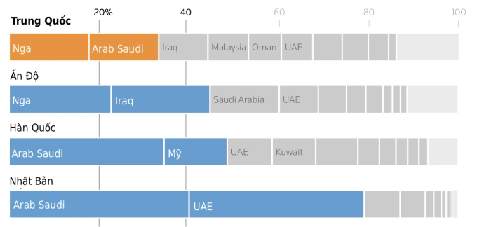 Cơ cấu thị trường nhập khẩu dầu thô của các nước. Nguồn: Trung tâm Thương mại Quốc tế